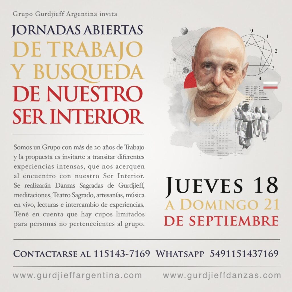 A QUE VINO EL SR. GURDJIEFF? (por C.S. Nott). Con respecto a la pregunta: “¿Qué vino a hacer?”, citaré un resumen de las conversaciones con un viejo amigo, F. S. Pinder, un hombre que estuvo muy cerca de Gurdjieff. Pinder dijo que Gurdjieff vino para dar un gran “Do”, para ayudar al avance de la… Leer más »A QUE VINO EL SR. GURDJIEFF? (por C.S. Nott).